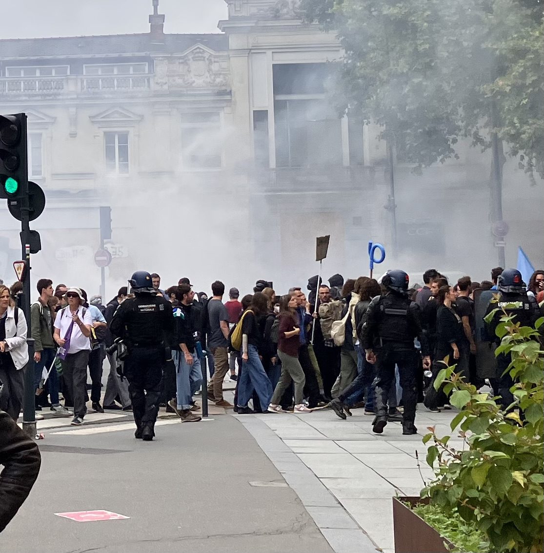 À 15h30, les forces de l’ordre ont eu recours à nouveau des gaz lacrymogènes devant le pont de Nantes, en réponse aux nombreux jets de projectiles, tirs de mortiers d’artifice et dégradations constatées sur plusieurs commerces (voir nos photos). « Ces violences sont imputées à un groupe clairement distinct du cortège syndical. L’usage des gaz s’est fait dans une direction opposée à celle du gros de la manifestation », tenait à préciser dans un communiqué la préfecture.