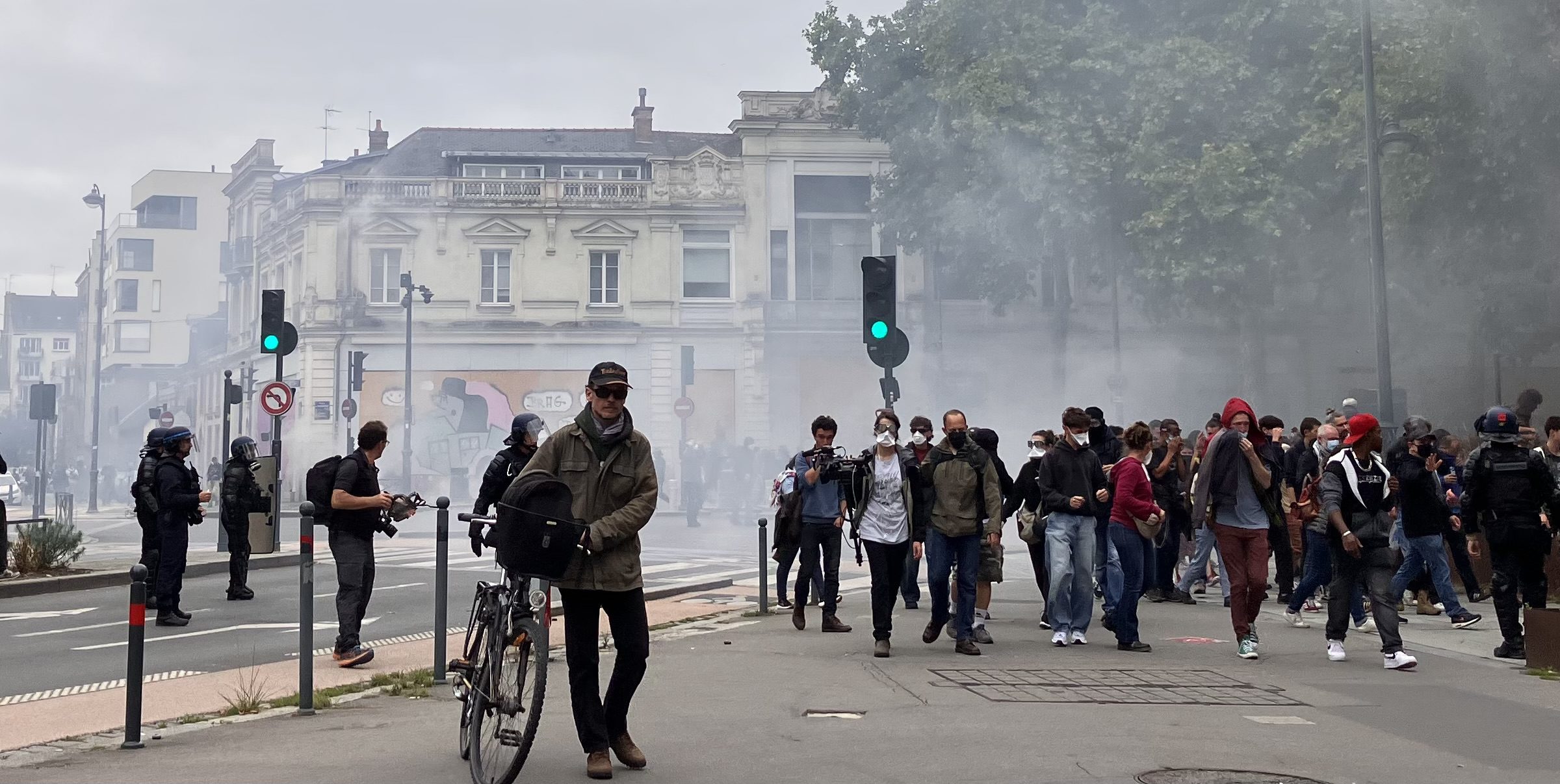 À 13h15, la mobilisation prenait de l’ampleur. Moins d’une heure plus tard, aux alentours de 14h20, une journaliste était contrainte de quitter le cortège après avoir été prise à partie par des individus hostiles, place de Bretagne. Au même moment, la situation s’est dégradée rapidement. À 14h30, des incidents éclataient en tête de manifestation. Des projectiles étaient lancés contre les forces de l’ordre qui repliquaient par des lacrymogènes. Quinze minutes plus tard, la préfecture annonçait la fermeture temporaire de la gare de Rennes, par mesure de précaution. À ce moment-là, le nombre de manifestants était estimé à 11 500.